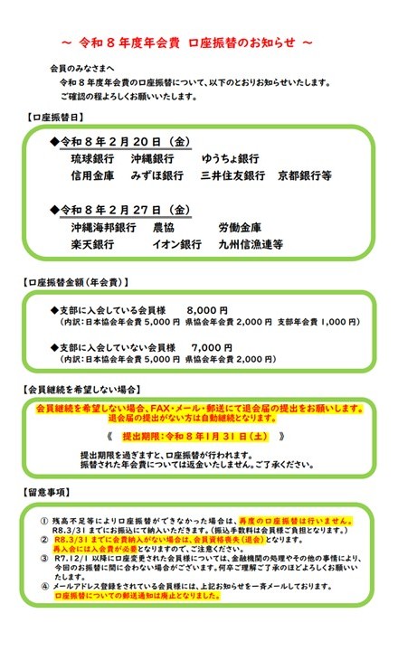令和8年度年会費の口座振替について、以下のとおりお知らせいたします。