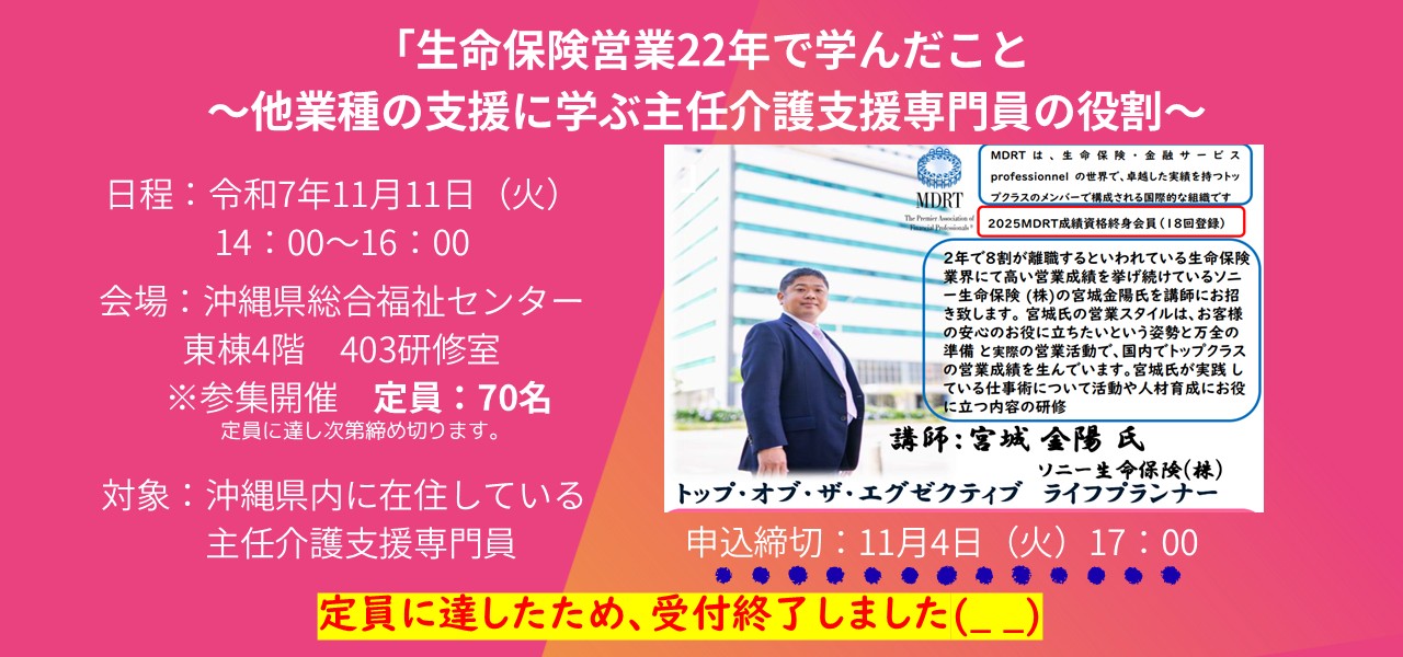 | 主 催 | 一般社団法人沖縄県介護支援専門員協会 (沖縄県から研修運営を委託) |