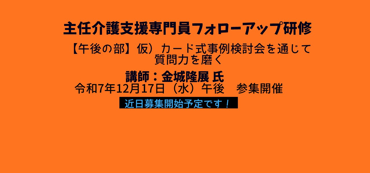作成日 2025/11/21 更新日 2025/11/21 主任介護支援専門員フォローアップ研修(午後の部)12/17(水)午後開催(参集開催)仮)カード式事例検討会を通じて質問力を磨く近日募集開始予定です。募集開始までしばらくお待ちください。